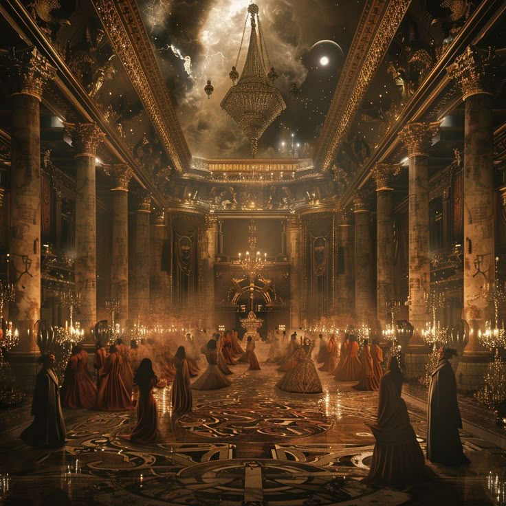 Gold firelight drips down obsidian walls, music thrums through the floor, and laughter curls in the air like smoke. Lust and vanity, hand in hand. Every corner reeks of desire and performance.