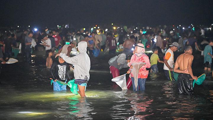 Masyarakat Lombok beramai-ramai menangkap cacing nyale dalam tradisi Bau Nyale di Pantai Seger (tempo.co)