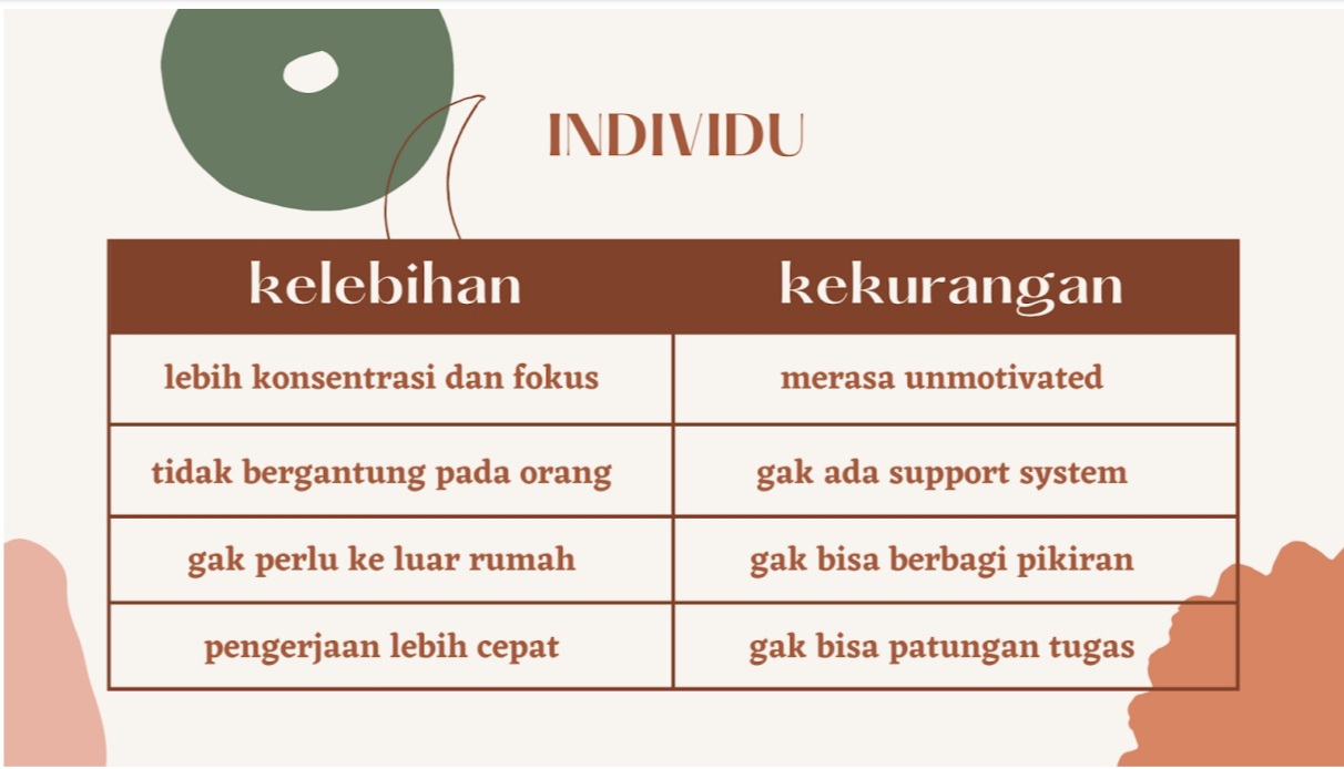 Udah gak diragukan lagi lah ya kalau kerja sendiri itu lebih baik daripada kerja kelompok. Gak bergantung sama orang lain, pengerjaan tugas lebih cepat, bisa konsentrasi dan fokus sama tugas, gak usah keluar rumah nyari tempat buat kerja kelompok jadi bisa dipastikan hemat dan aman di rumah aja. Tapi kalau tugasnya berat dan banyak buat kita jadi ogah-ogahan juga ngerjainnya ya. Terkadang juga bahkan jadi merasa unmotivated karena gak ada temen buat ngerjain tugas tersebut.