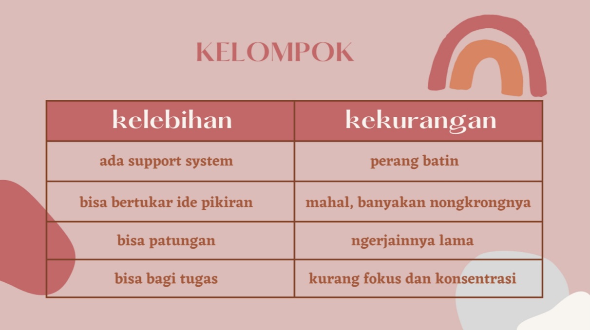 Siapa yang bilang kerja kelompok gak enak? Enak kok, kalau semua anggotanya niat. Iya emang intinya kerja kelompok yang enak harus dimulai dari diri sendiri dulu sih. Kalau kamu niat, yang lain juga ikut-ikutan niat. Bisa ngerjain tugas bareng, merasa termotivasi buat ngerjain tugas tepat waktu, ada support system, ide yang didapat dari mana saja, bisa bagi-bagi tugas terus sat set sat set kelar deh!