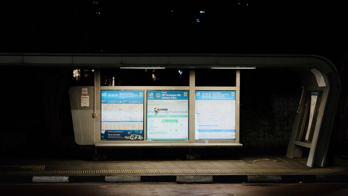 Raflan berhenti di halte TransJakarta. Bangkunya kosong. Ia duduk dan menyandarkan punggung, menatap jalan tanpa tujuan jelas. Lampu halte menyala terang, kontras dengan jalan yang mulai sepi.
