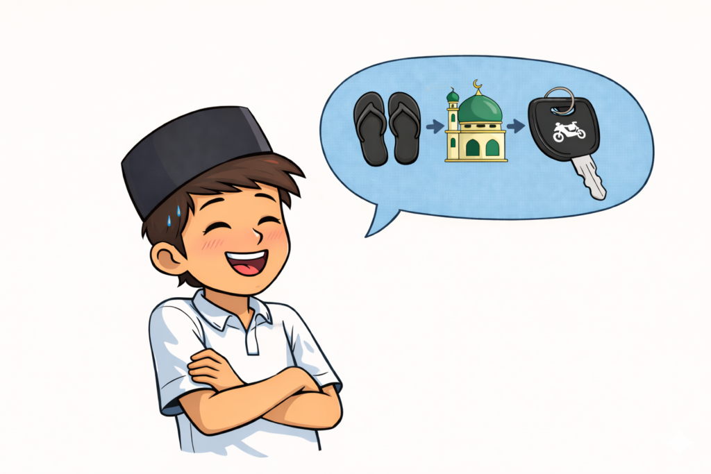 Kenzo merasa ribuan mata jamaah mulai memperhatikannya. Ia terjebak dalam dilema yang membuatnya mematung, sementara bisikan di kepalanya terus mengulang kalimat yang sama: Pilih salah satu atau lo pulang nyeker dan jadi bahan ghibah seumur hidup!