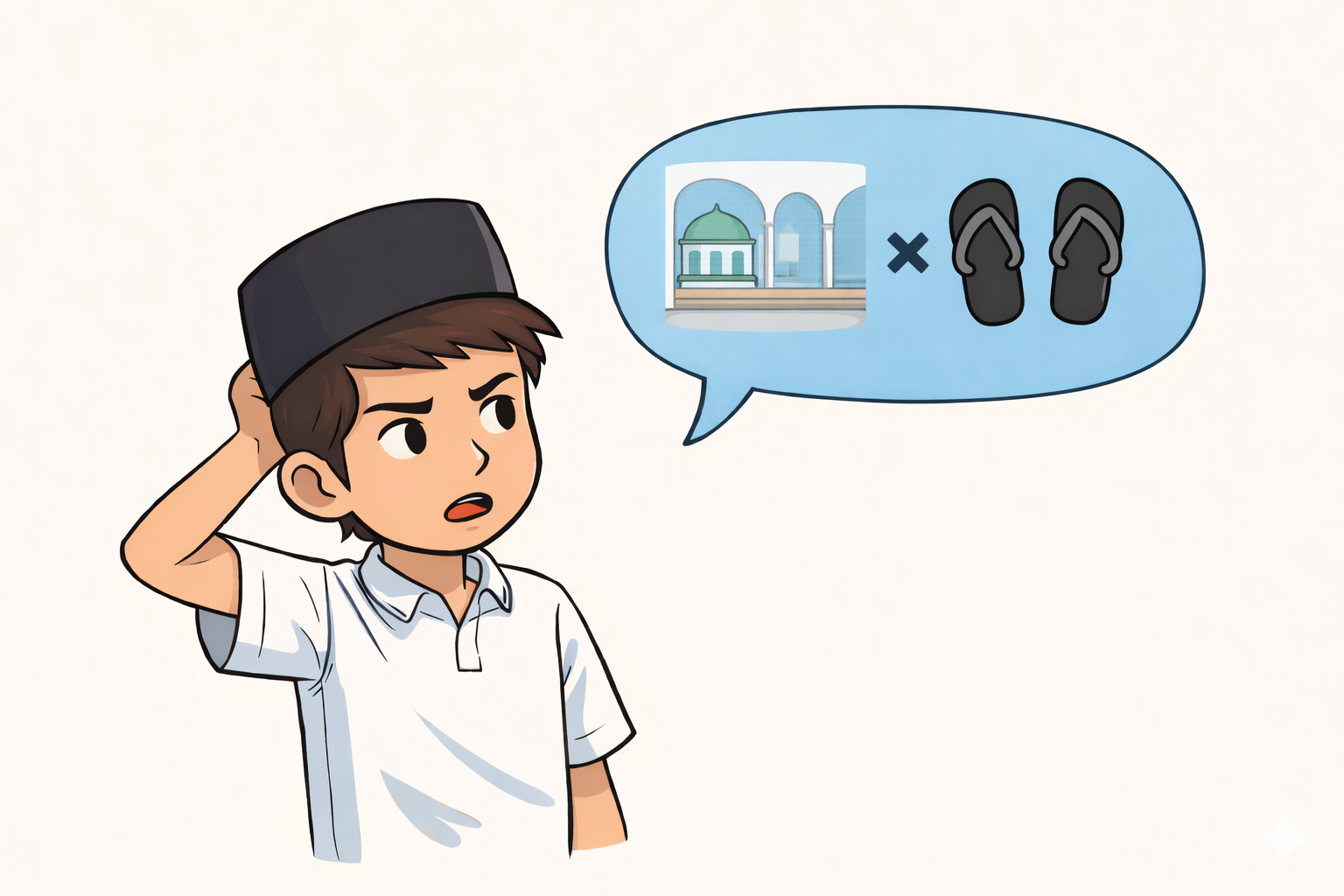 “Apa sendal gue melakukan pembelahan diri karena kelamaan ditinggal Tarawih? Atau ini semacam glitch dalam simulasi kehidupan?” Kenzo mulai gagal damai dengan isi kepala tepat di batas suci Masjid Al-Ikhlas.